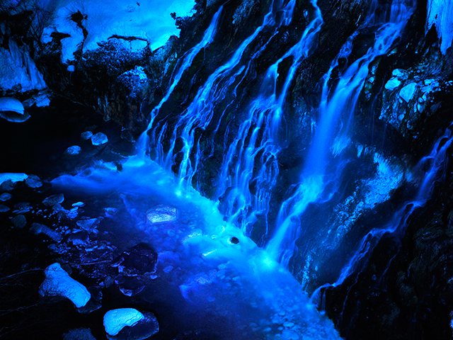 十勝岳連峰の地下水が溶岩層の割れ目から染み出し美瑛川へと流れ込んでいる潜流瀑(せんりゅうばく)。日本では珍しい滝の1つで、落差30m・滝幅40mの大きさです。ブルーリバーの異名を持つ美瑛川の青さも美しく、橋の上から青と白のコントラストを楽しめます。夕方からは一年を通してライトアップが点灯。白金温泉街の入り口にあり宿から歩いて行くこともできるので、夕食後や早朝など雰囲気の異なる滝を気軽に見に行くことができます。