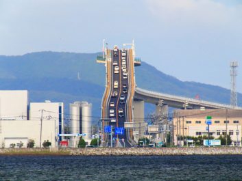 鳥取県境港市と島根県松江市を結ぶ全長1446mの橋。5千トン級の船が下を通れるように一番高いところでは高さ約45メートルに達するためかなりの急勾配がついています。車のテレビCMで登場した際に、その急勾配さゆえ「ベタ踏み坂」と名付けられ一躍有名になりました。 -