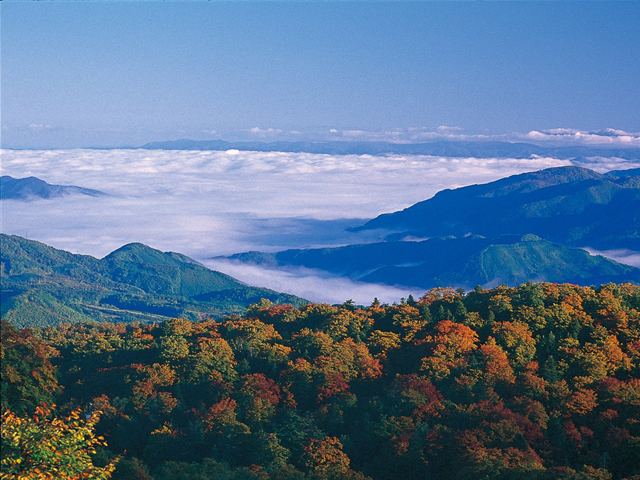 岩手の八幡平温泉と秋田トロコ温泉を結ぶ全長約27kmの八幡平アスピーテラインは、岩手山から八幡平に連なる雄大な山々が楽しめる。標高1614mの頂上へは、県境駐車場から歩いて約20分。遊歩道も整備されていて、1周1時間くらい。11月上旬~4月下旬まで通行止め。新緑は6月中旬、紅葉は9月下旬。原始の森が残る新緑&紅葉のメッカ