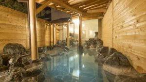 白馬の森に佇む 天然温泉リゾートホテルの白馬ホテルオークフォレスト。屋根付きの露天風呂と、天井が高く窓が広くとられた内湯を備えた男女別天然温泉大浴場は、開放感抜群です。