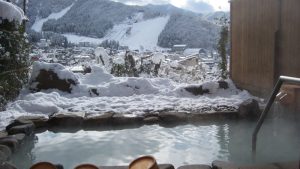 栂池高原スキー場ゴンドラ乗り場まで徒歩2分のリゾートインマリオンシナノ。最上階にある天然温泉大浴場「白馬栂池温泉」から見る、北アルプスの眺望が美しいです。