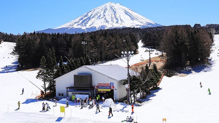 【富士山バックの特等席】 圧倒的な富士山ビュー!都心から近く、パークアイテムも豊富なため、春のスノボ練習に多くの若者が集まります。