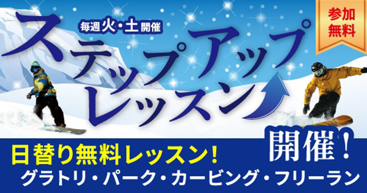 今シーズンから、初級者~中級者向けの「ステップアップレッスン」を日替りで開催いたします。毎回異なったレッスン内容となり、カービングやグラトリ、パーク、フリーランなど幅広い内容を、無料(※1)でレッスンいたします。カービングは「ラマ先生」率いる「R-LABO」、グラトリやパークは「高橋レオ」率いる「グラトリ&パークスクール竜王校」、フリーランは「橋本通代」率いる「LION SNOWBOARD SCHOOL」がレッスンを実施いたします。
