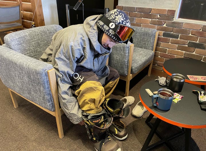 通常、ゲレンデの休憩所は混雑していて席の確保も一苦労。しかしここは予約制の為、座れるスペースが多く混雑なし。朝の到着から帰りのバス出発まで、ほぼ1日自由に利用できました。 靴を脱いで上がれるリラックススペースがあり、ブーツで疲れた足を解放できるのが至福。