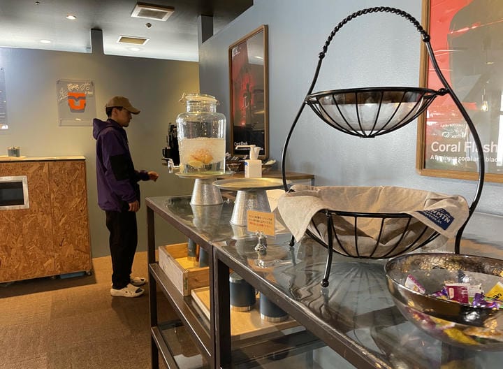 ラウンジ内はドリンクバー完備で、コーヒーやソフトドリンクが飲み放題。さらに専用のロッカーや更衣スペースもあります。 一般利用だとそれなりの料金がかかりますが、バスツアーの「ラウンジ付きプラン」を選ぶと、事前予約ができ、お得に利用できるとのこと。