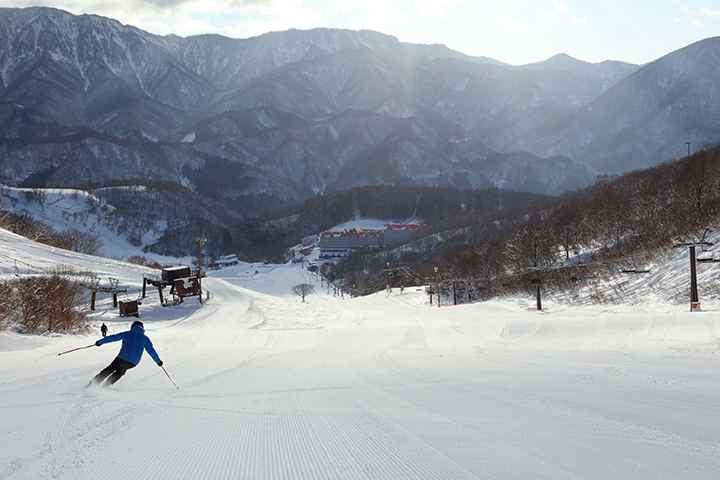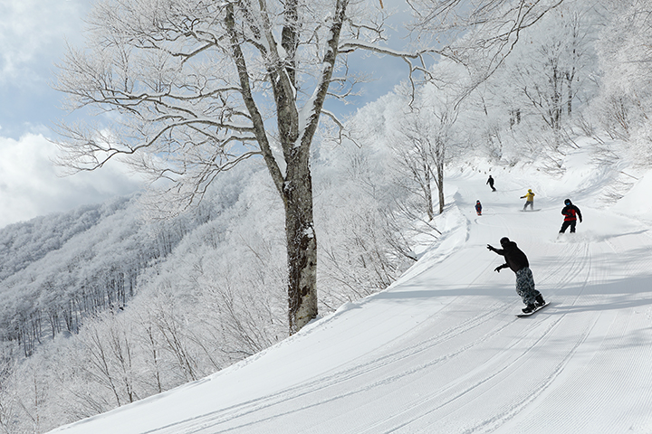 スリルよりも癒やしを求めるなら、山頂から続く稗田山林間コースがおすすめ。約2kmにわたるロングクルージングでは、霧氷を纏った木々が作り出す幻想的な景色の中を滑り降りることができます。晴れた日には、遠く雨飾山や火打山を望む大パノラマが広がり、まさに非日常のひとときを味わえます。