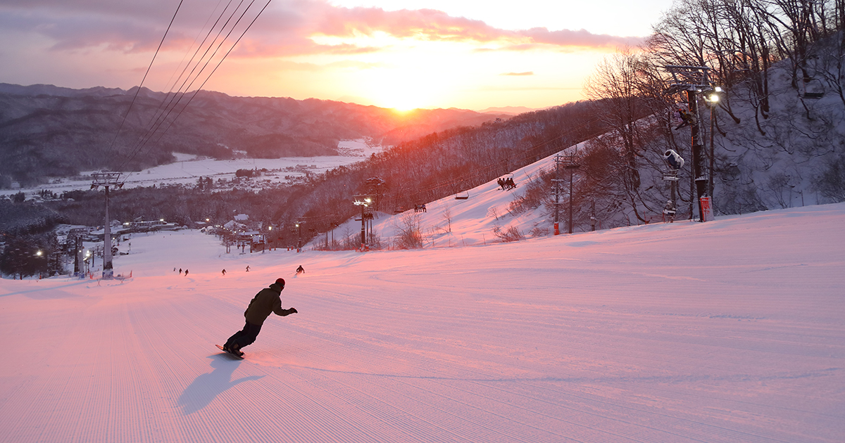 朝焼けに染まる誰もいないゲレンデに最初のシュプールを描く贅沢は格別です!さらに同日18時からはナイターも開始。