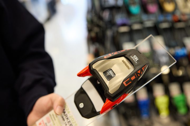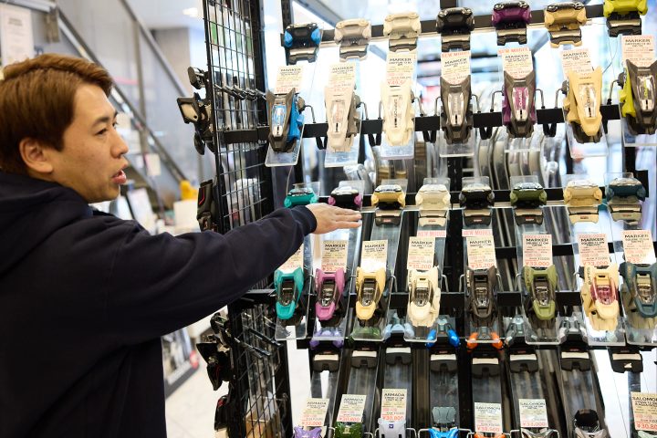 人気の理由としては、カラーが豊富なのとあとはすごく軽い、軽さがあるのとオープンモードがついてて歩くことが容易になるのでバックカントリーとかにも一応対応して、大体どのスキーでも合わせられる仕様になっているんですよ。