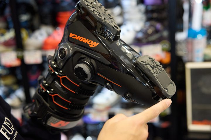 ソールは2種類あって、昔からあるフラットなアルペンソール、あとはグリップウォークと呼ばれる歩きやすいラバーのソールがあります。この2、3年で出てる板ってのはどちらのソールでもなんの調整もなしに履けるんです。ただし、古いスキー板にはグリップウォークが対応していない板もあるので注意が必要です。