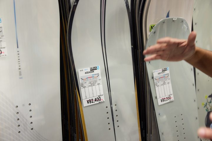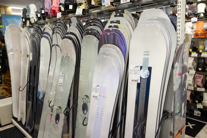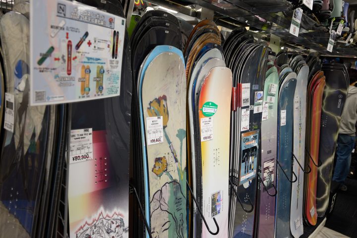 店舗の1階はスノーボードギア、2階はスキーギア、3階はアクセサリー(ゴーグル、グローブ等)、4階はウェア。こちらに来ていただければ、スノーボードの道具が上から下まですべて揃います。特に、コアなブランドが充実していますので、ぜひご来店ください。
