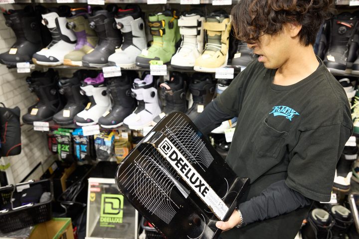 店舗の1階はスノーボードギア、2階はスキーギア、3階はアクセサリー(ゴーグル、グローブ等)、4階はウェア。こちらに来ていただければ、スノーボードの道具が上から下まですべて揃います。特に、コアなブランドが充実していますので、ぜひご来店ください。