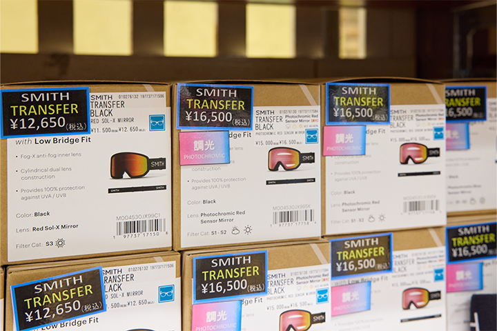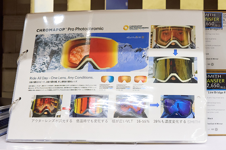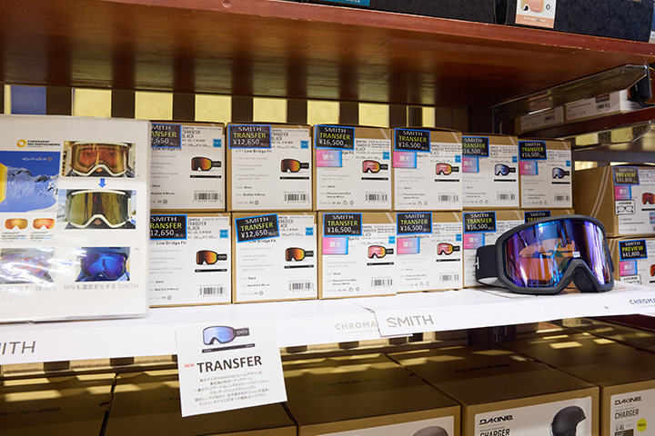 初心者におすすめなのは「SMITH(スミス)」の「Transfer(トランスファー)」というモデルですね。調光レンズが加わって、全天候対応となっているゴーグルです。調光レンズはレンズの色自体が紫外線の量で自動的に色が変わるゴーグルで、代表的なブランドがSMITHです。ゴーグルの値段は年々上がっているのですが、この機能を兼ね備えている「Transfer」は16,500円(税込)と手が届きやすい価格帯です。もし調光レンズの機能が不要であれば、1万円強で購入も可能ですよ。