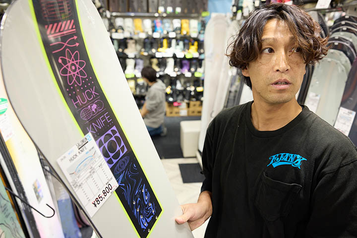 店舗の1階はスノーボードギア、2階はスキーギア、3階はアクセサリー(ゴーグル、グローブ等)、4階はウェア。こちらに来ていただければ、スノーボードの道具が上から下まですべて揃います。特に、コアなブランドが充実していますので、ぜひご来店ください。