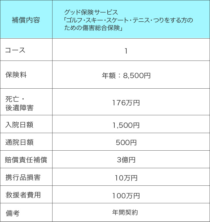 グッド保険サービスの「ゴルフ・スキー・スケート・テニス・つりをする方のための傷害総合保険」は年間契約のため、1年を通して色々なスポーツを楽しむ方にお勧めです。月額換算で708円ほどなので、それほど割高でもない割に補償内容はかなり充実しているので、検討する価値のある保険といえます。