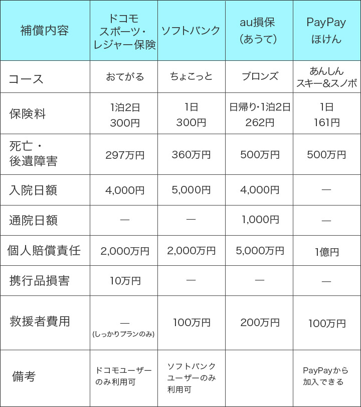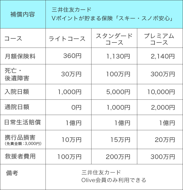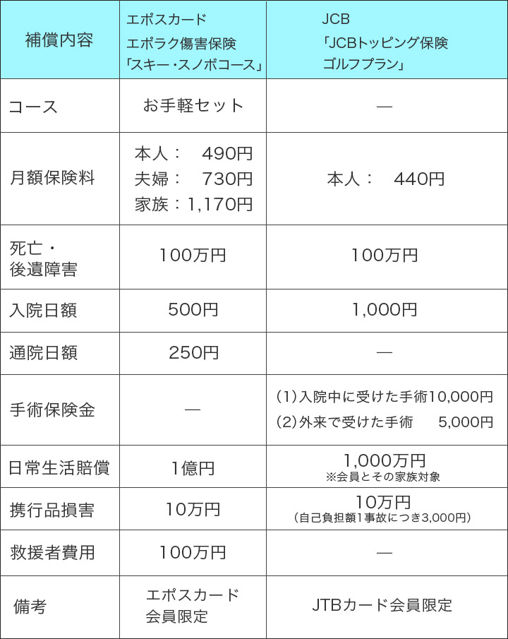 リーズナブルな価格ですが、補償内容を見るとスキー・スノーボードの際に備えておきたい補償は充実しています。