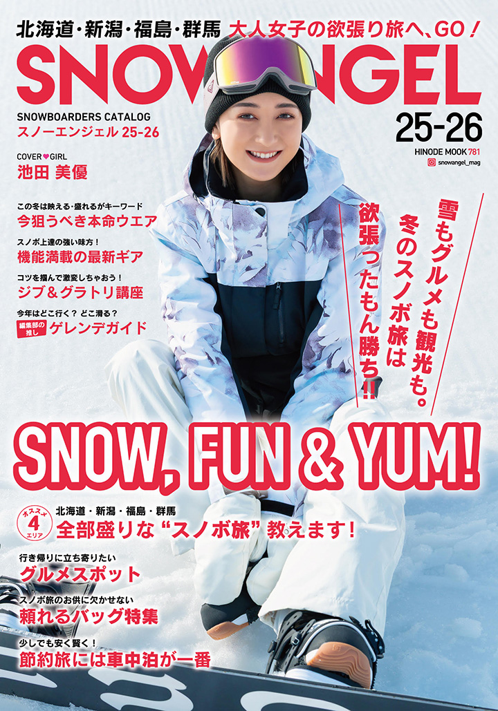 表紙には、昨年に引き続きスノーボード好きで知られる「みちょぱ」こと池田美優さんを起用。『SNOW ANGEL』では毎号、人気・話題の女優を起用することにもこだわっています。