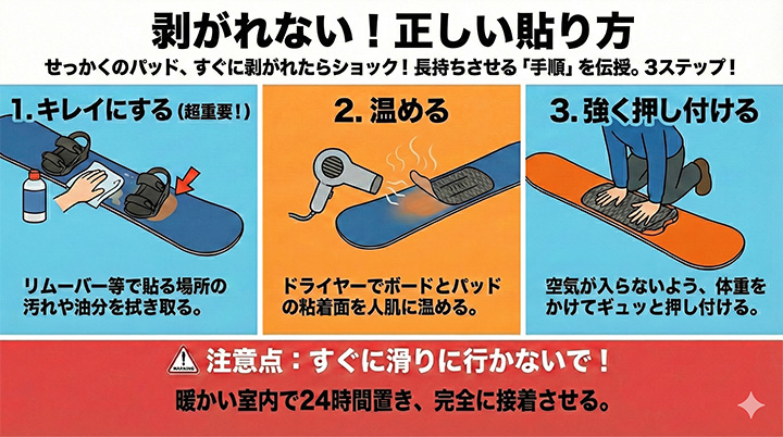 せっかく可愛いパッドを買っても、ゲレンデですぐに剥がれてしまったらショックですよね。長持ちさせるための「魔法の手順」を伝授します。