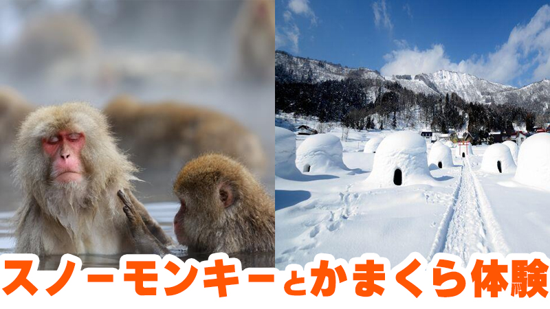 1日目は温泉に浸かるサル「スノーモンキー」観賞&かまくら体験でSNS映え間違いなし、2日目は初心者でも安心の斑尾高原スキー場でスキーorスノーボードを楽しめます⛷️