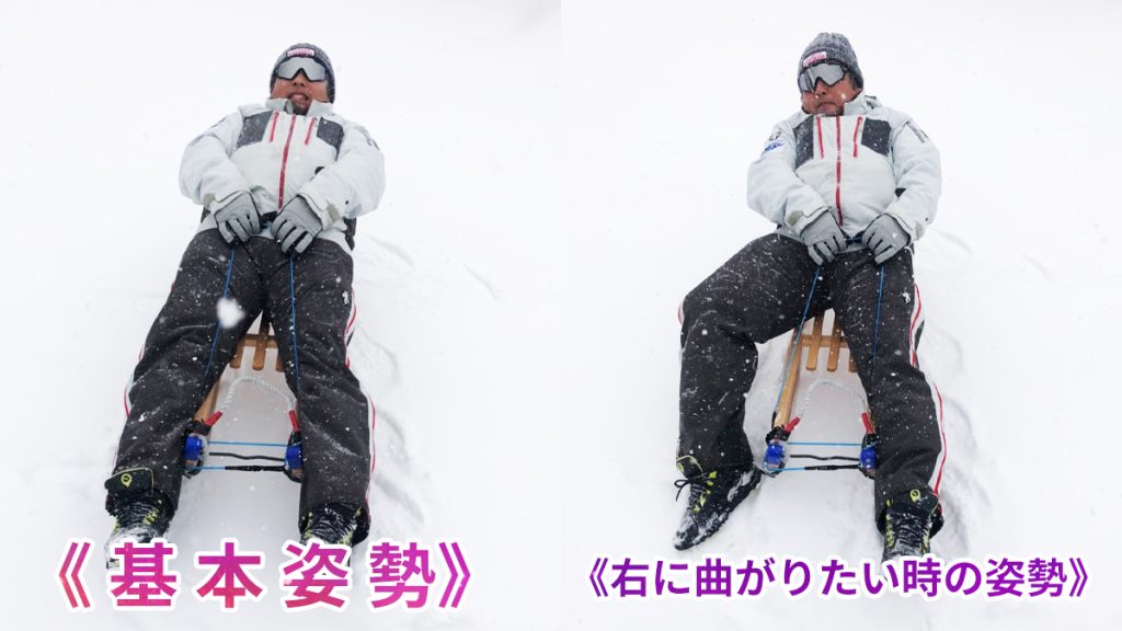 - 曲がりたい時:曲がりたい方向の足裏を雪上に付ける!