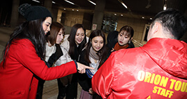 赤又は黄色のジャンパーを着た係員が受付を行っています。